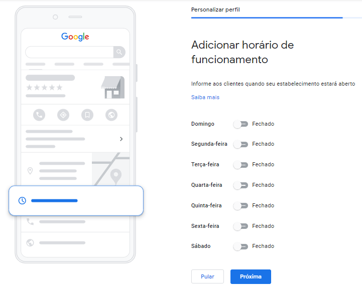 O próximo passo é inserir o horário de funcionamento da empresa. Inclusive, quando há feriado, o Google envia e-mail perguntando se a empresa vai ter um horário de funcionamento diferenciado.