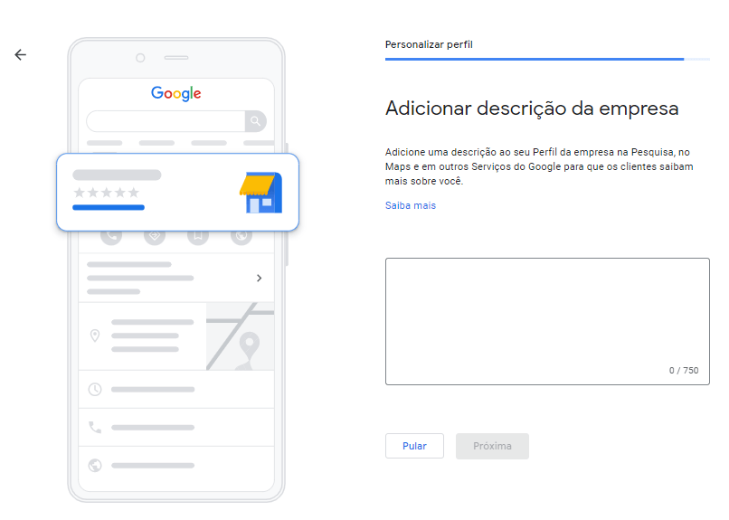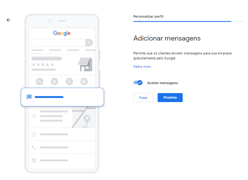 Quase chegando ao fim... Você pode optar por potenciais clientes enviarem mensagens para a empresa por meio do Google. Outro ponto importante é adicionar a descrição do seu negócio (máximo de 750 caracteres).