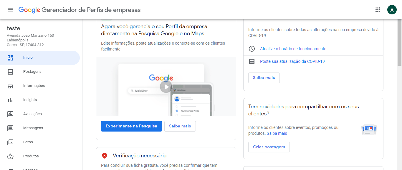 Assim é a aparência do gerenciador do Google Meu Negócio. Você pode usar essa página para inserir outras informações consideradas importantes. Uma delas é o código que você vai receber por correio para concluir a verificação da sua ficha no Google.
