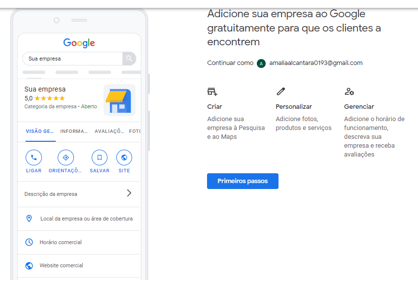Google Meu Negócio para efetuar o login com a conta que você já tem ou fazer uma nova. Após esse passo, o Google vai pedir que você coloque um número de celular e um e-mail de recuperação, caso ocorra algo com a sua conta. Um código de verificação será encaminhado para esse e-mail e deverá ser inserido no campo que aparece na sua tela. Pronto. Agora é só começar a configurar o seu negócio no Google!