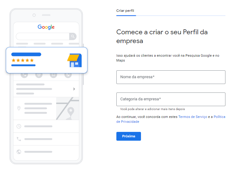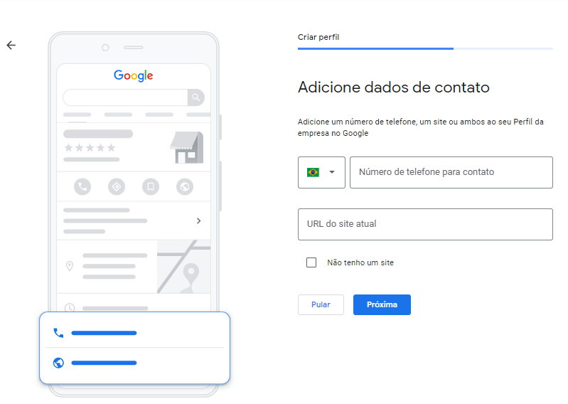 Continue completando o seu perfil. Insira dados essenciais de contato, como o telefone da sua empresa e o seu site.